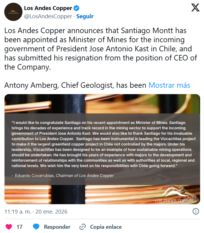A escasas horas de que el presidente electo, José Antonio Kast, oficialice su equipo ministerial este martes 20 de enero, la confirmación de Santiago Montt como futuro titular de Minería ha detonado críticas instantáneas del oficialismo. La controversia estalló tras el comunicado de Los Andes Copper, que informó la renuncia de Montt a su gerencia general para integrarse al gobierno que asume el 11 de marzo.